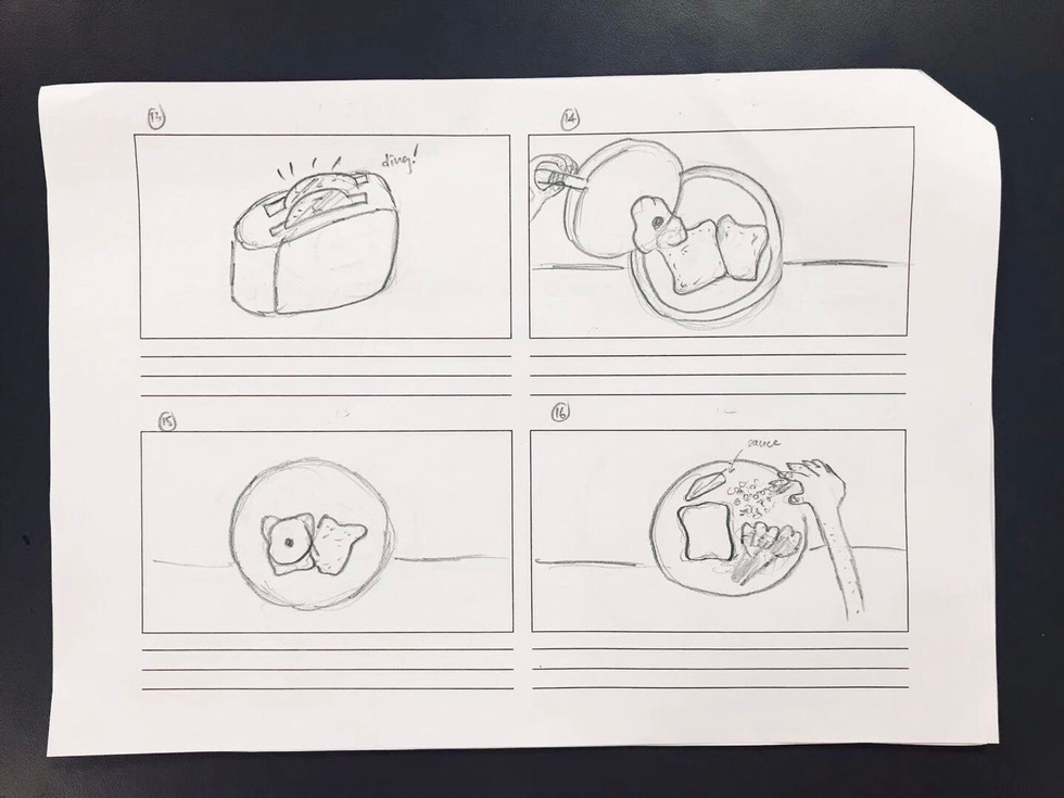 Then, we separated into groups to work on the scenes of making breakfast. After a few minutes of discussing, we decided to prepare a meal of toasts, eggs, beans and vegetable with a cup of coffee. This used to be our daily common breakfast, so we just drew it out. There are 24 scenes in the total.